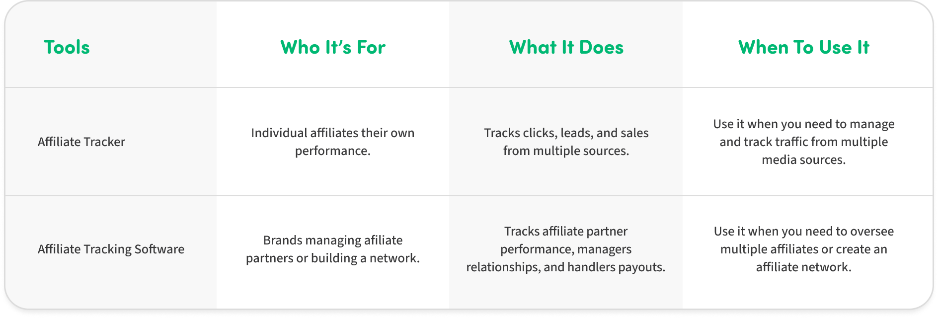 If you're an affiliate yourself, you should also consider getting an affiliate tracker. Here’s a simple guide to the difference between affiliate trackers and tracking software: